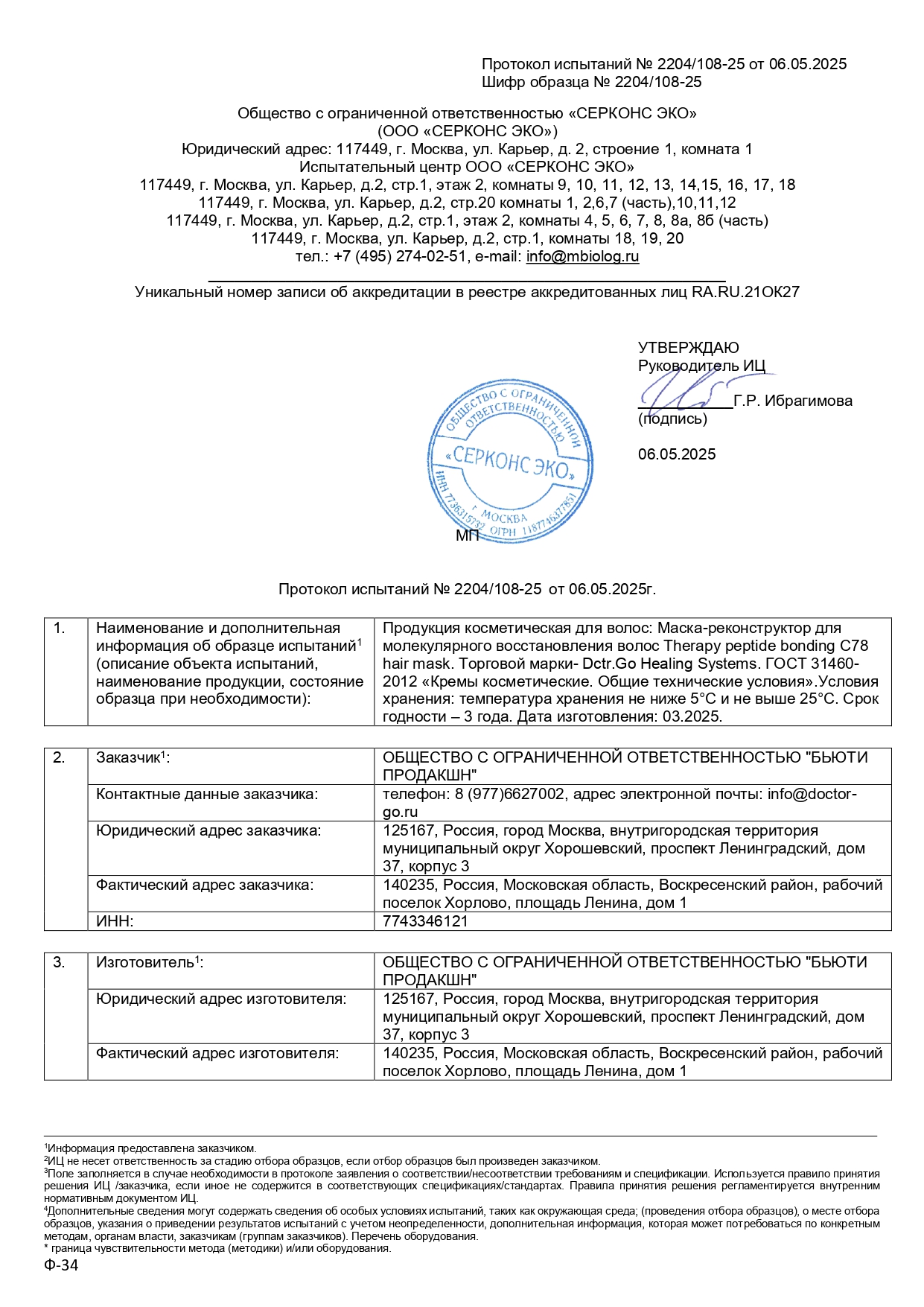 Вложимость в коробках (кол-во шт в 1 коробке): 20 Анонс: Супер ХИТ! код ТН ВЭД: 3305900009 Бренд: DctrGo Healing Systems Вес: 0,05 Производитель: ООО Бьюти продакшн Страна производитель: Россия Тип упаковки: Ваакумный диспенсер Сезон: Всесезонный продукт Год создания: 2024 Нишевая парфюмерия: Tiziana Terenzi Kirke Extrait de Parfum Название модели: Peptide Bonding 78 Класс опасности товара: не опасен Пол: унисекс Область использования: Москва Эффект: Молекулярное восстановление Тип волос: Для всех типов волос Единиц в одном товаре: 1 Условия хранения: от +5 до + 25 Способ применения: Нанести на влажные волосы после шампуня Срок годности: 36 мес - 2 отзыва к товару Несмываемая маска для восстановления волос после окрашивания и осветления Therapy peptide bonding C78 hair mask в Казани